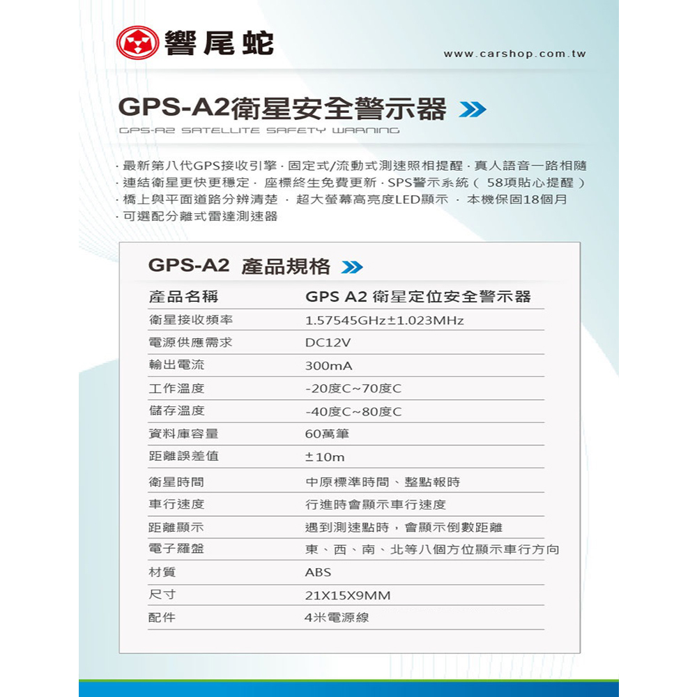 產品名稱:響尾蛇 GPS-A2 GPS行車安全語音警示器